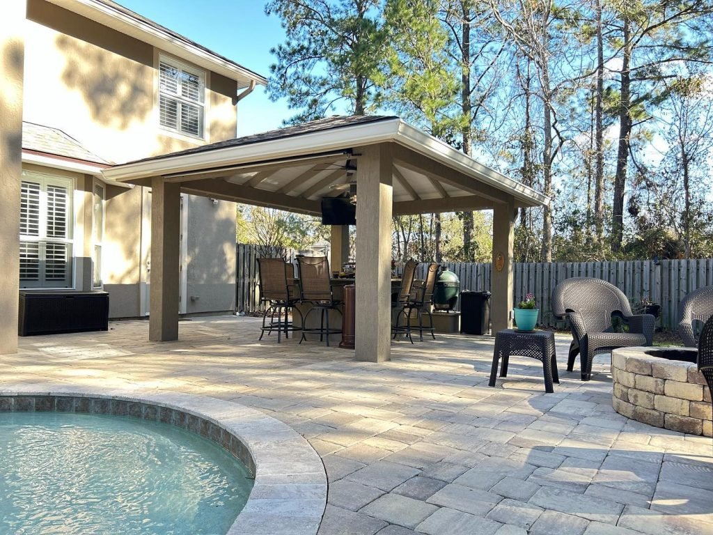 - Select outdoor furniture that complements your paver design for added comfort and style
